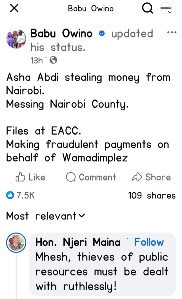 Embakasi East MP Babu Owino has turned his focus on Nairobi County’s Chief Officer for Finance, Asha Abdi, accusing her of draining taxpayers’ money through fraudulent deals that have left the capital struggling.