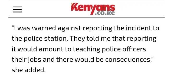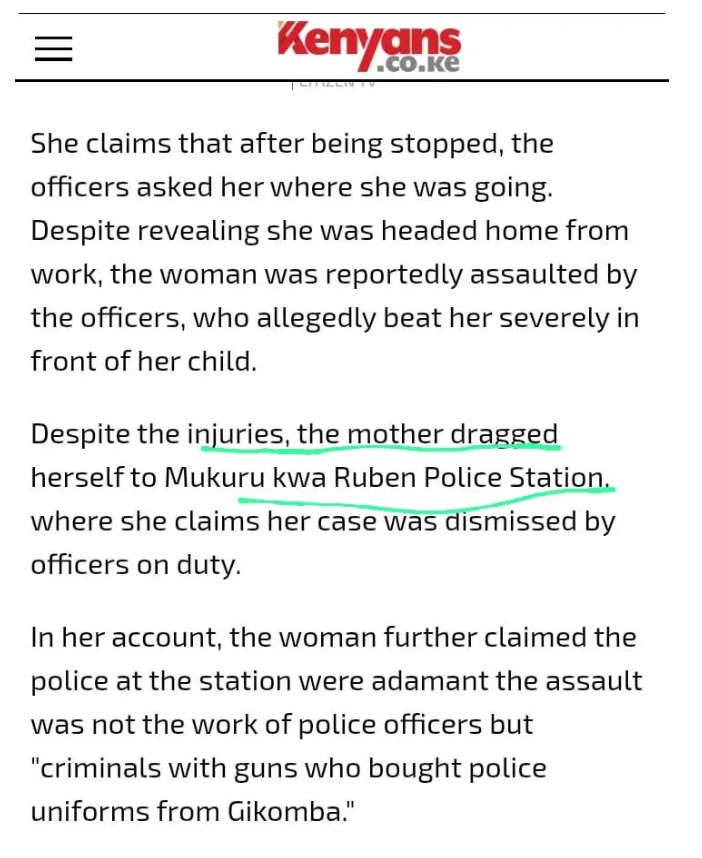 However, she claims the officers there did not take her seriously. Instead of helping, they dismissed her report and told her the attackers were likely just criminals who had bought police uniforms from Gikomba.