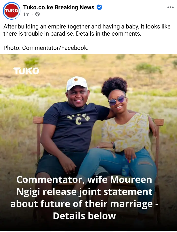 The news of Commentator and his wife Mourine Ngigi going their separate ways has surprised many of their followers who had grown to admire them as a couple.