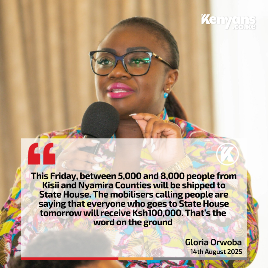 Former nominated senator Gloria Orwoba has made serious claims that thousands of people from Kisii and Nyamira counties are being promised Ksh100,000 each to attend an event at State House on Friday, August 15.