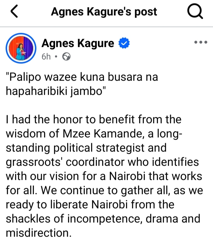 She shared that she had met Mzee Kamande, a respected political strategist and grassroots organizer, and spoke highly of the guidance she received from him.By quoting a Swahili proverb that emphasizes the value of elders and wisdom, she underlined her belief that Nairobi’s problems can be solved through experience and clear thinking. She ended her message with the words “Freedom is coming,” showing her determination to push for change.