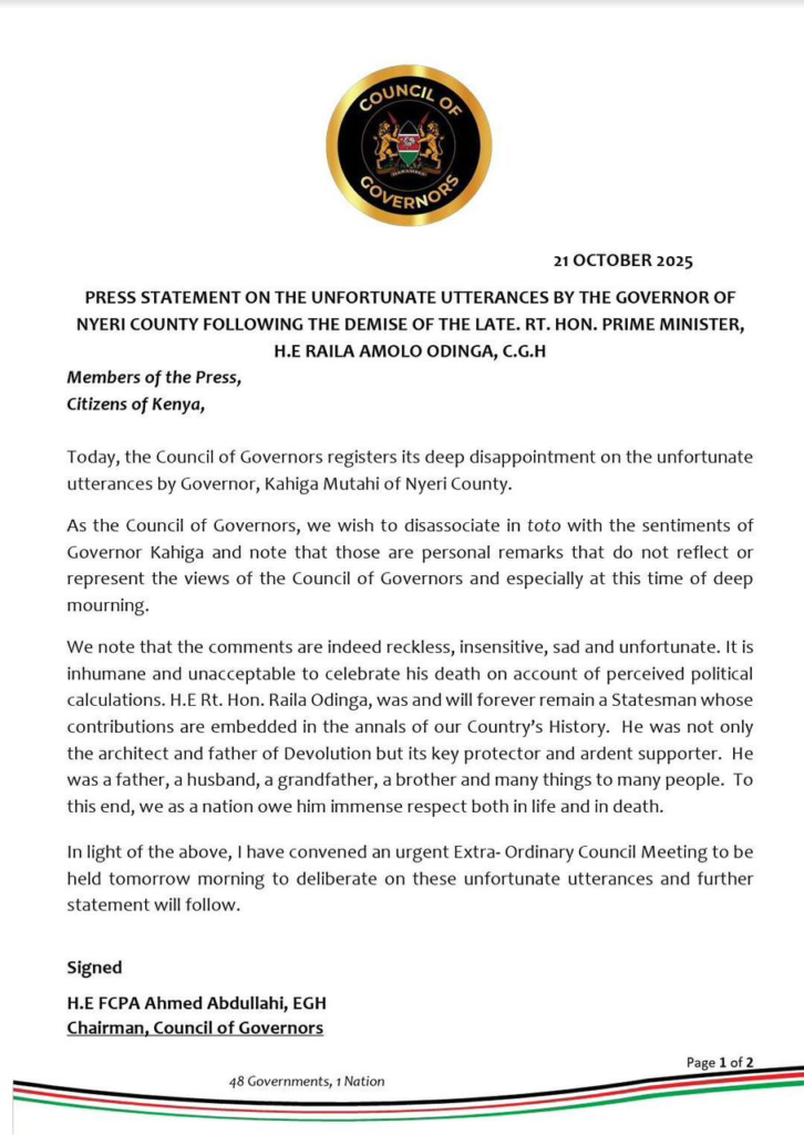 The Council of Governors (CoG) has now called for an extraordinary meeting to address the matter, terming Kahiga’s comments as reckless, insensitive and deeply disrespectful.