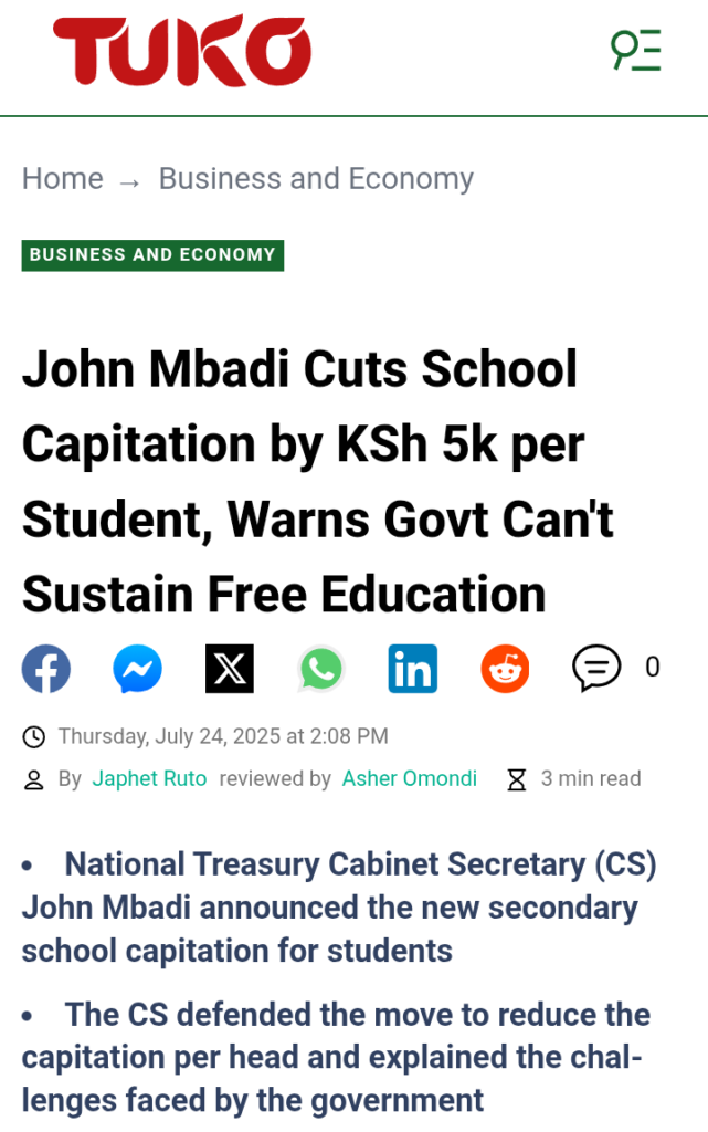 His recent move to reduce secondary school capitation by KSh 5,344 per student has raised concern among parents, teachers, and political leaders.