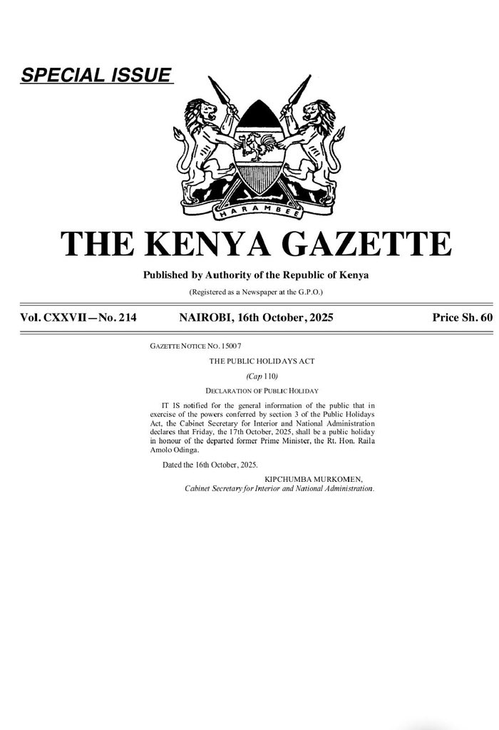 The gazette notice read that in the exercise of powers granted under the Act, the Interior Cabinet Secretary declares Friday, October 17, 2025, a public holiday in honour of the former Prime Minister.