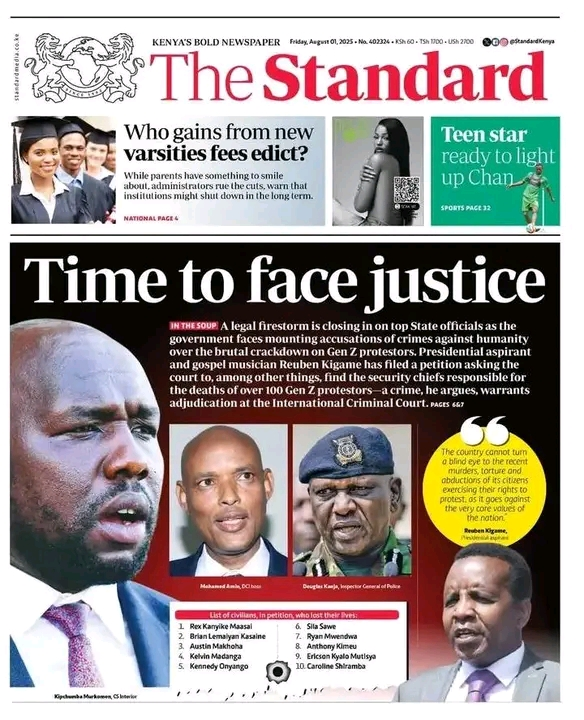 The case has been filed in the High Court’s criminal division in Nairobi. Those named in the suit include Interior Cabinet Secretary Kipchumba Murkomen, Inspector General of Police Douglas Kanja, DCI Director Mohamed Amin, National Intelligence Service boss Noordin Haji, and Director of Public Prosecutions Renson Ingonga.