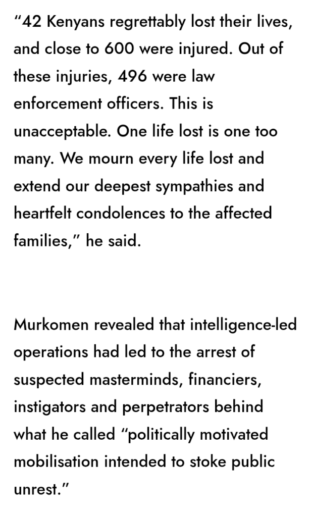 Confirming that 42 people were killed and over 1,500 arrested, Murkomen chose to focus on defending state actions rather than confronting the disturbing reality that under his leadership, the Interior Ministry failed to protect lives.