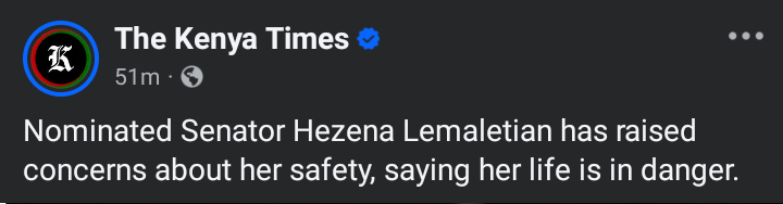 Nominated ODM Senator Hezena Lemaletian has raised fresh alarm over her personal safety, stating that her life is in danger and that she has already alerted the relevant authorities.