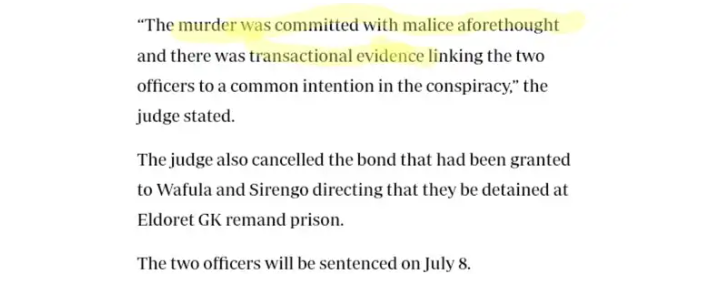 Justice Reuben Nyakundi ruled that Constables Emmanuel Wafula and Godwine Wekesa Sirengo acted together in planning and executing the crime.