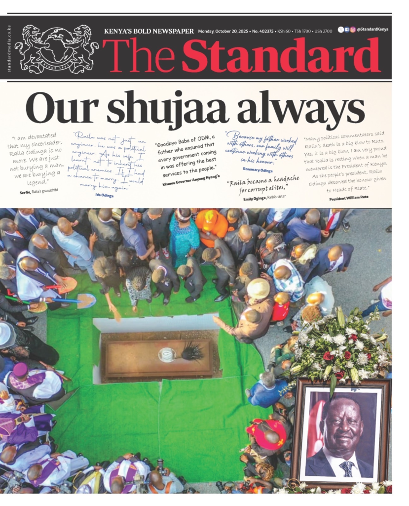 In a powerful and poignant front page, The Standard newspaper on Monday, October 20, 2025, encapsulated the nation’s profound sense of loss following the burial of former Prime Minister Raila Odinga, leading with the simple yet resonant headline: