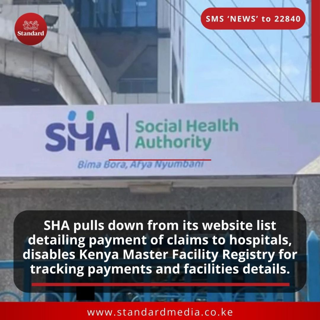 Adding to the controversy, SHA has also disabled the Kenya Master Facility Registry, an online portal that was useful for the public to track payments and verify details of registered facilities.