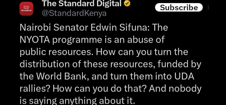 Speaking during a live interview on Citizen TV tonight, Sifuna claimed the disbursement of Nyota funds has been turned into United Democratic Alliance (UDA) rallies.