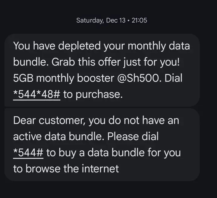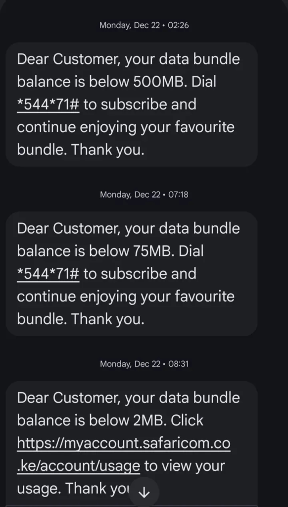 The problem did not end there. On December 25, she purchased another all-in-one bundle worth KSh 1,000, which included 8GB of data and 400 minutes. Despite this, she says that by December 28 she again received a message saying she had no active data bundles. By her own calculation, from December 10 to December 28, she had spent a total of KSh 6,297 on data and call bundles, yet still found herself disconnected.