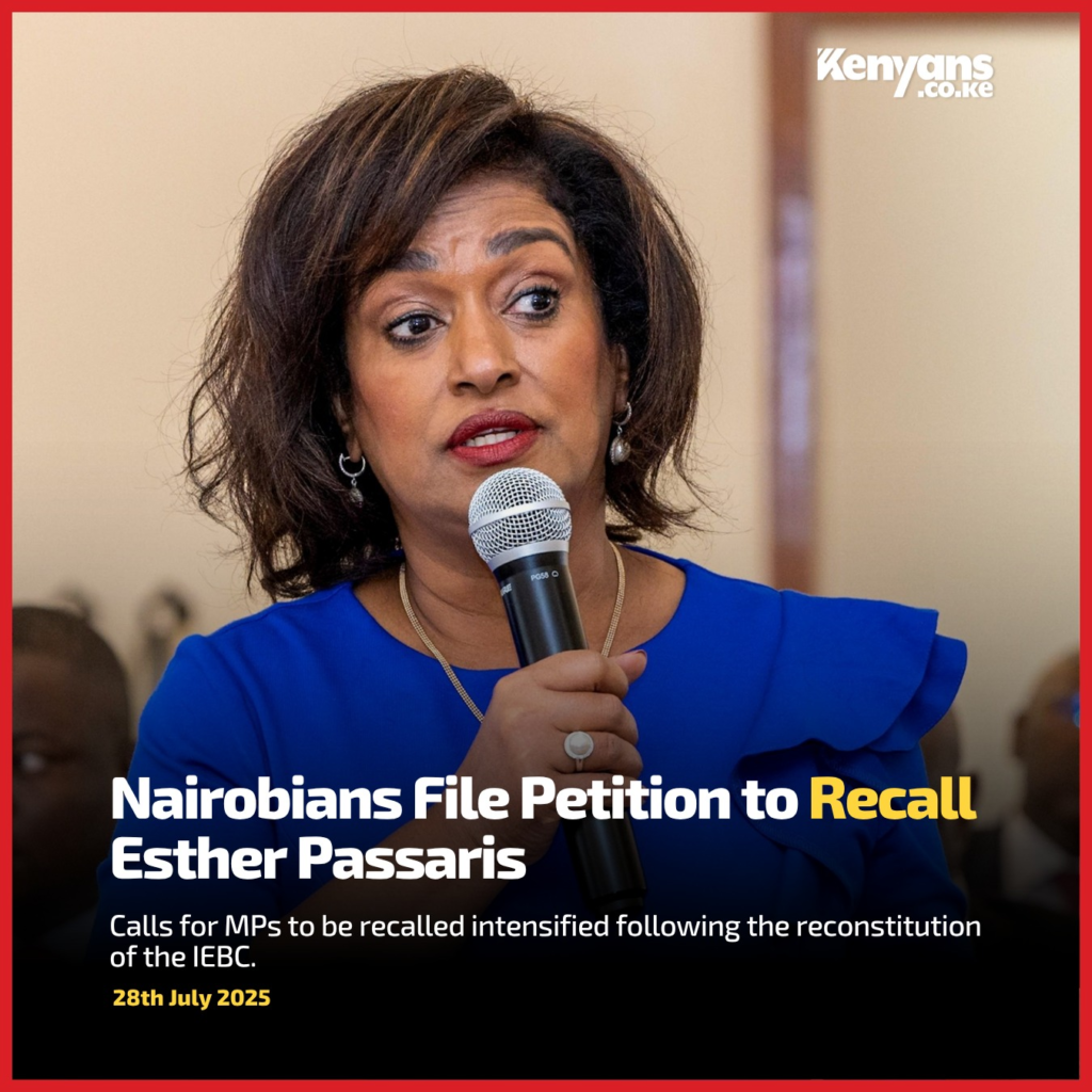 A group of Nairobi residents has officially filed a petition with the Independent Electoral and Boundaries Commission to recall Esther Passaris, the Woman Representative of Nairobi County.
