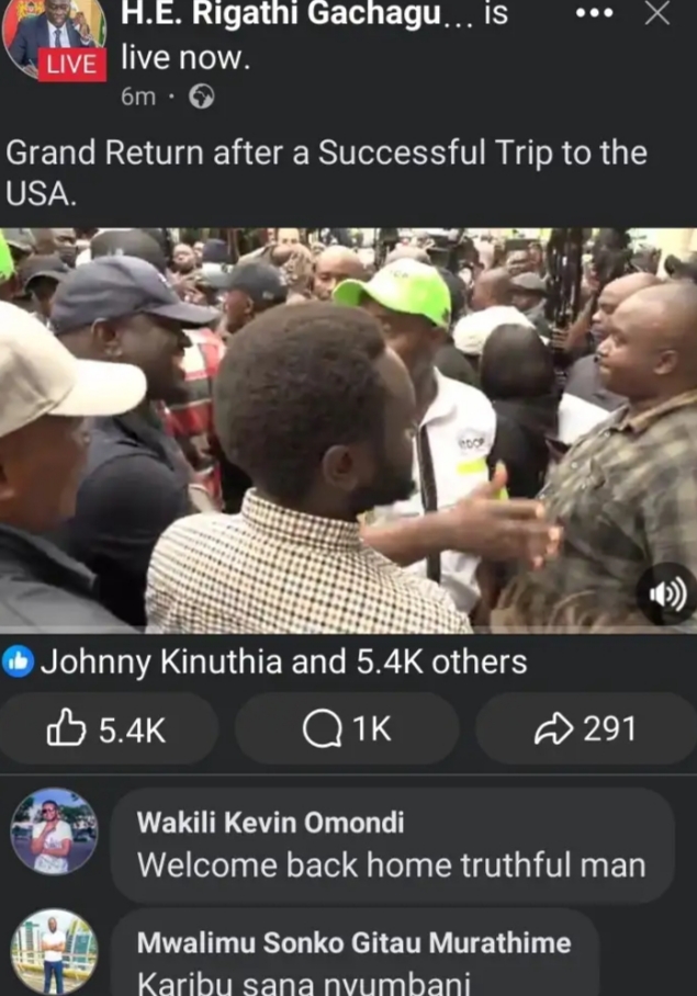 Former Deputy President Rigathi Gachagua has made a return to Kenya after spending nearly two months in the United States, and his arrival drew a huge reception at Jomo Kenyatta International Airport.