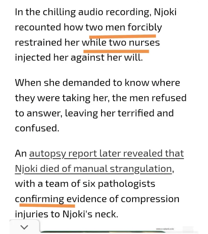 However, the latest findings from medical experts clearly state she died inside Chiromo Hospital. Witnesses say Njoki appeared scared and confused, repeatedly asking where she was being taken.