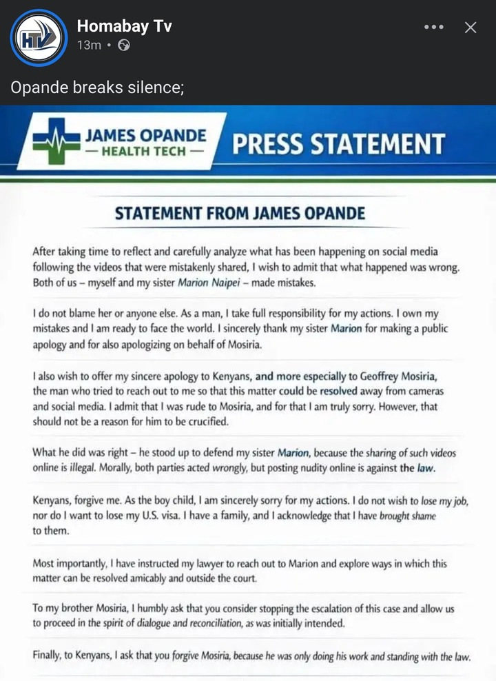 On Wednesday, January 21, Opande issued a public statement on social media, acknowledging his wrongdoing and taking full responsibility for his actions.