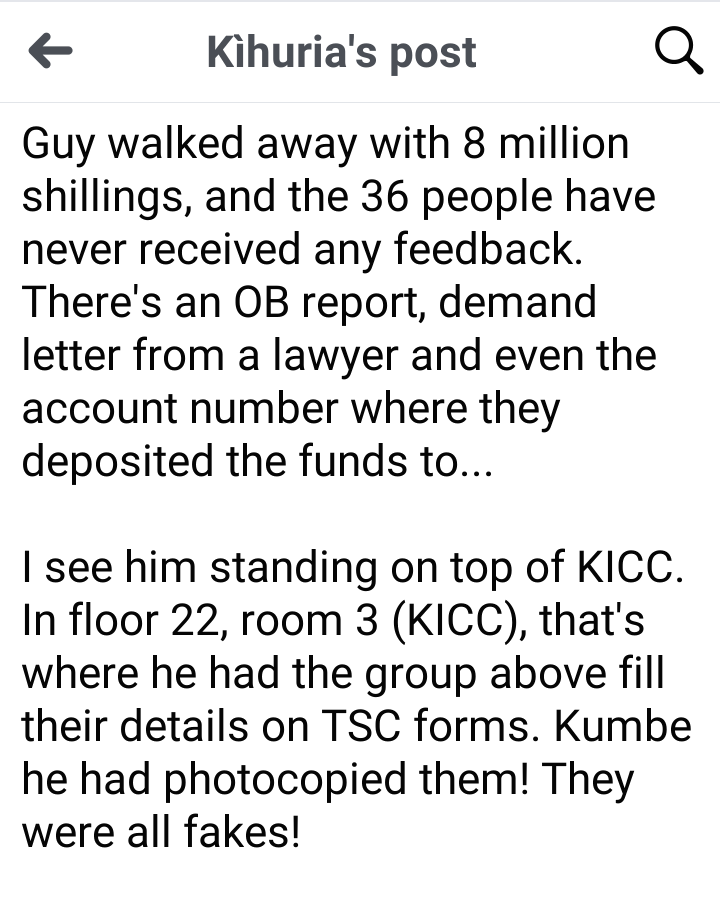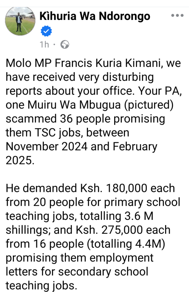 In a Facebook post, he claimed that between November 2024 and February 2025, Muiru allegedly conned 36 people by promising them teaching positions with the Teachers Service Commission.